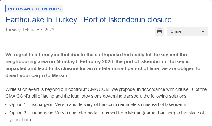 Cma issued a notice on February 7 saying that the port of Iskenderun had been affected by a strong earthquake and would be closed for a period of time, so it had to divert cargo to Mersin. The following two schemes are provided: